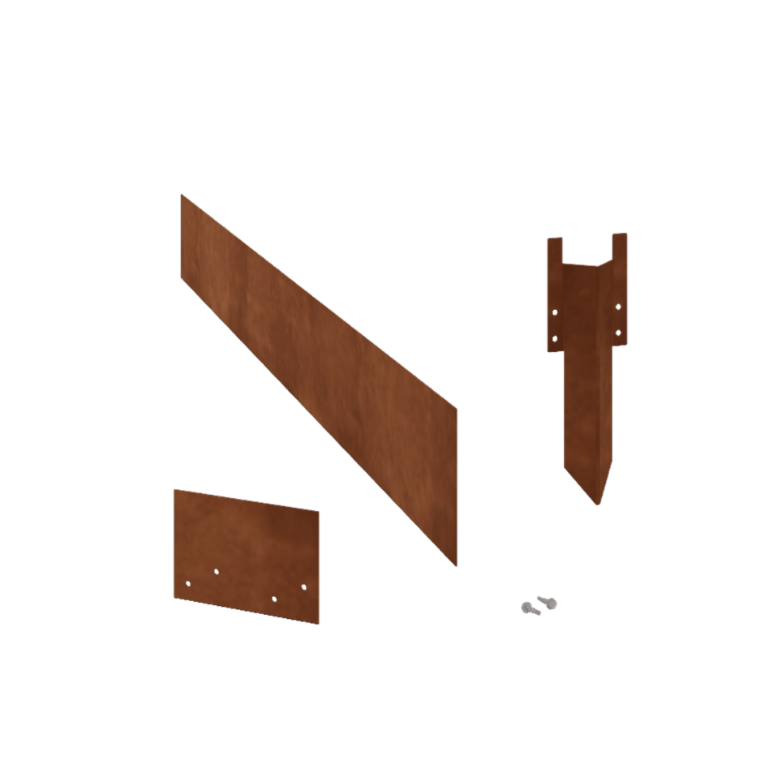 Disse kantsten er fremstillet af højkvalitets Corten-A stålplade. Denne metallegering har den unikke egenskab, at den danner en meget tæt oxidhinde (rustlag). Gennemrustning er derfor umulig. Den tætte oxidhinde beskytter det dybere liggende materiale mod ilt, hvilket stærkt forsinker oxidation, mens korrosionen fortsætter. Kantstenen leveres rustfri i den grå metalfarve. Rustprocessen starter inden for de første 2 måneder, og der er ingen behandling nødvendig. Under rustprocessen kan kantstenen afgive. Cortenstål er en metallegering bestående af jern, kobber, fosfor, silicium, nikkel og krom.