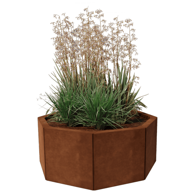 Øverste kanten er dobbelt ombøjet. Dette giver plantekassen et tidløst og robust udseende. Rustfarven giver et varmt udseende og gør disse plantekasser anvendelige i moderne og klassiske haver. Materialetykkelsen afhænger af højden. Plantekasser op til en højde på 60 cm har en tykkelse på 1,5 mm. Fra en højde på 80 cm er materialet 2 mm tykt. Det er grundigt testet, at disse tykkelser er tilstrækkelige til plantekasserne.