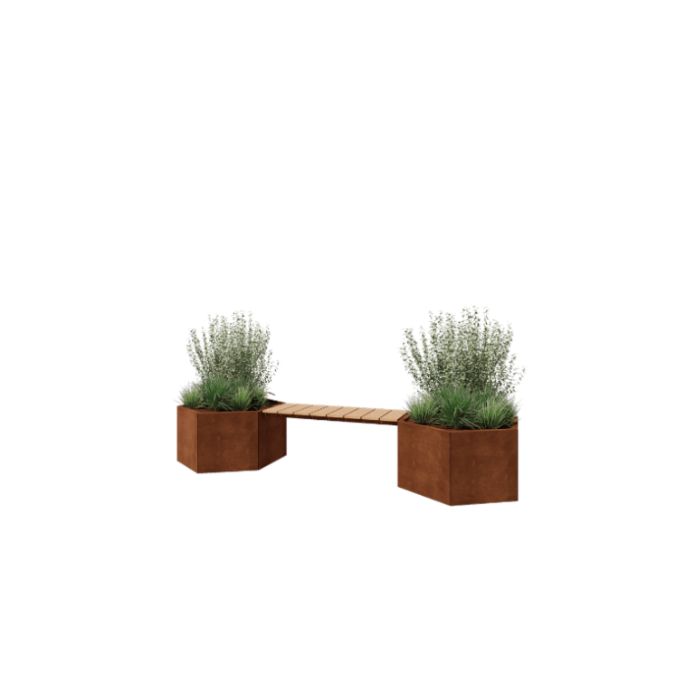 Denne modulopbyggede planter er ideel til store haver, terrasser og offentlige områder, hvor grønne planter og komfort går hånd i hånd. Kombiner nemt flere sekshjørnede plantekasser og matchende hjørneelementer for en unik og personlig indretning. Takket være cortenstålets vedligeholdelsesfri egenskaber forbliver planter længe flotte, mens bænkens holdbare træ giver ekstra siddekomfort. Brug farverige planter eller prydgræsser til at bringe dit udendørsrum til live.