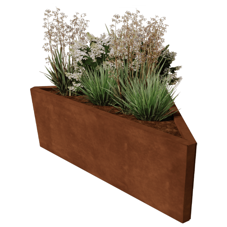 Denne plantekasse er en modulær stålplantekasse, der leveres som et byggesæt. Plantekassen er opbygget af løse paneler og hjørnebeslag. Kasserne kan fuldstændigt blindt forbindes. Der er ingen synlige fastgørelser. Takket være vores modulære system er også meget store dimensioner mulige. Ved at bruge hjørnebeslag er der unikke former, som ikke findes andre steder som standard. Se vejledningen for mere information.