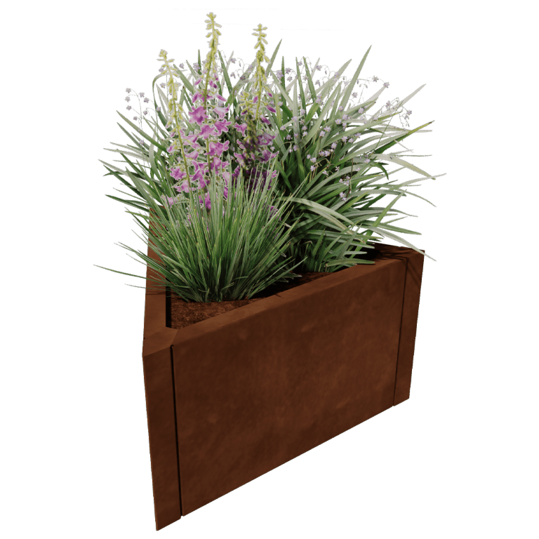 Type Alaska er en trekantet plantekasse. Plantekassen har et robust udseende og en flot kantafslutning. Den trekantede form af Alaska er anvendelig i alle slags haver. Takket være den trekantede form er Alaska nem at placere i et hjørne. Vores modulære system gør det meget nemt at samle kasserne.