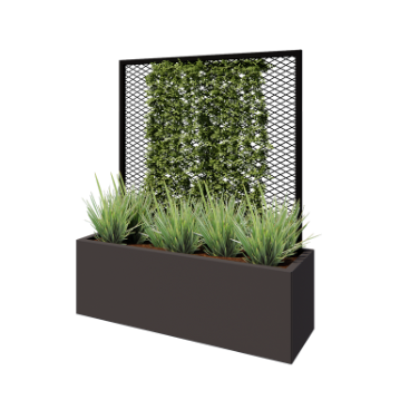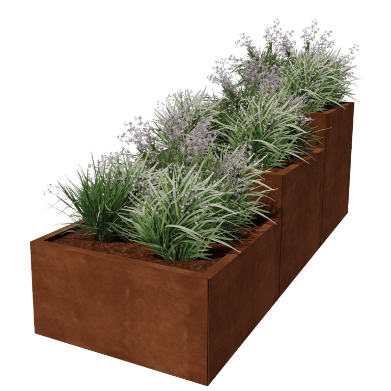 Denne plantekasse er en modulær stålkasse, der leveres som et byggesæt. Plantekassen er opbygget af løse paneler og hjørnebeslag. Kasserne kan fuldstændigt blindt forbindes. Der er ingen synlige fastgørelser. Gennem vores modulære system er også meget store dimensioner mulige. Ved at bruge hjørnebeslag er der unikke former, som ikke findes andre steder som standard. Se vejledningen for mere information.
