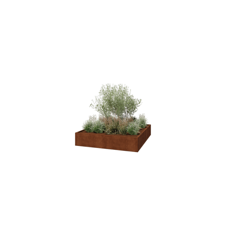 Cortenstål plantekasse - Firkant - 200 x 200 x 40 cm - Svejset - Uden bundplade giver din have et robust og moderne udtryk. Den måler 200 x 200 x 40 cm og rummer rigeligt plads til prydgræsser, små træer og blomstrende planter. Det fuldt svejsede design skaber en sømløs og solid konstruktion i ét stykke, og plantekassen leveres uden bundplade, så du kan placere den direkte på jord eller græs for et naturligt look. Kassen er lavet af 2 mm cortenstål og udvikler naturligt et beskyttende rustlag; rustprocessen starter inden for få uger til måneder og kan tage 1–2 år at fuldende. Bestil nu og nyd et robust, vedligeholdelsesvenligt haveelement i mange år.